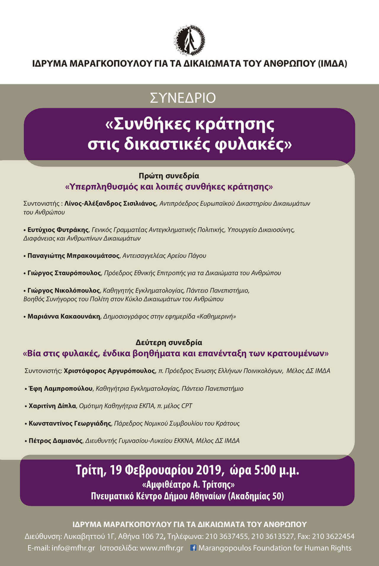 Το Ίδρυμα Μαραγκόπουλου για τα Δικαιώματα του Ανθρώπου, διοργανώνει συνέδριο με θέμα: «Συνθήκες κράτησης στις δικαστικές φυλακές»