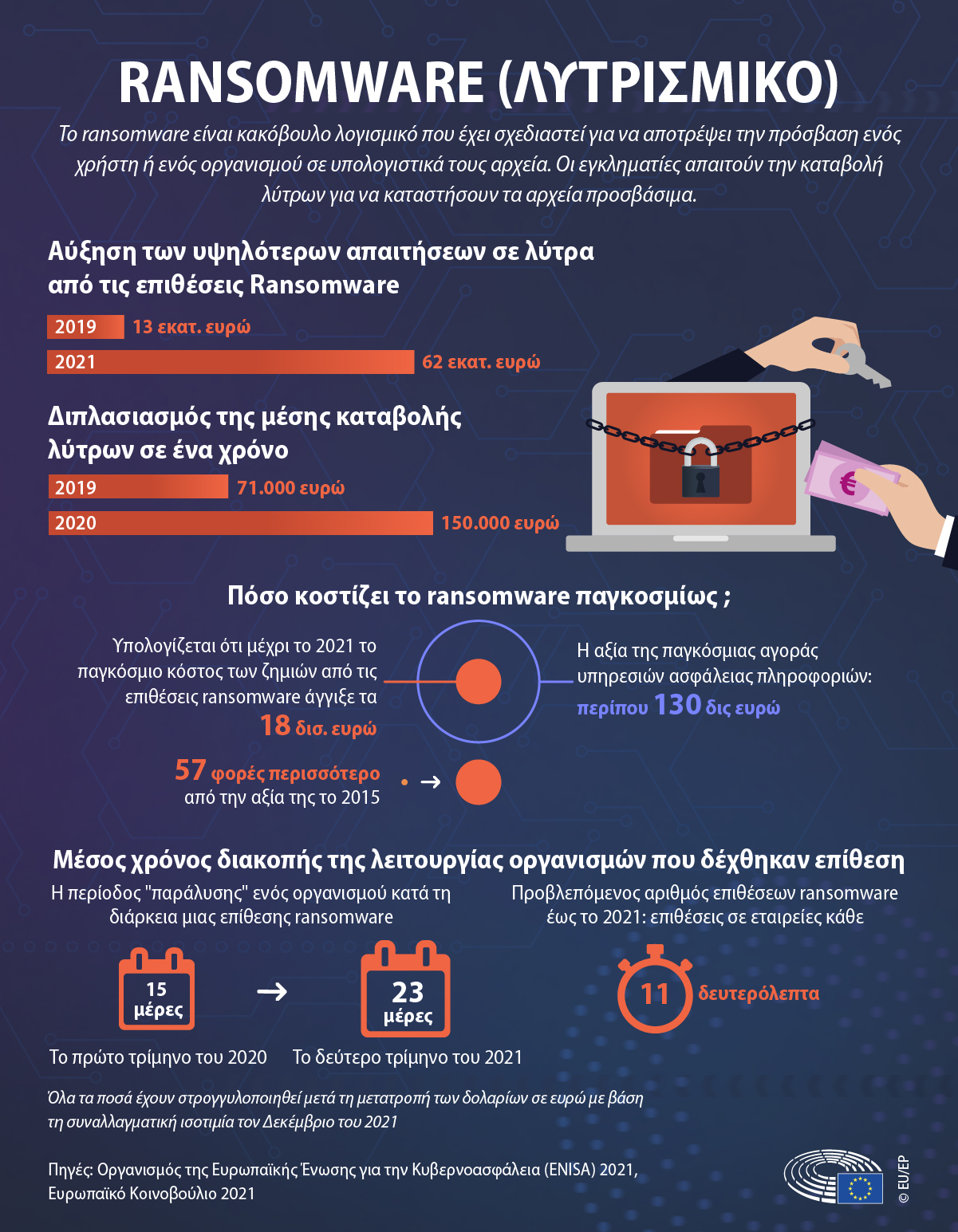 Σύμφωνα με τα στοιχεία του Οργανισμού της ΕΕ για την Κυβερνοασφάλεια, τα ποσά που ζητήθηκαν στα πλαίσια της καταβολής λύτρων αυξήθηκαν από τα 13 εκατ. ευρώ το 2019 στα 62 εκατ. ευρώ το 2021. Επίσης, ο μέσος όρος καταβολής λύτρων διπλασιάστηκε από 71.000 ευρώ το 2019 στα 150.000 ευρώ το 2021. Εκτιμάται ότι το 2021, το παγκόσμιο κόστος των ζημιών από επιθέσεις ransomware έφτασε τα 18 δις ευρώ - 57 φορές περισσότερο από το ποσό του 2015.