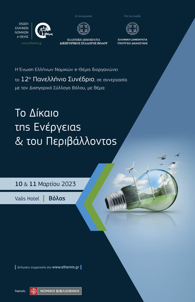 Η Ένωση Ελλήνων Νομικών e-Θέμις σε συνεργασία με τον Δικηγορικό Σύλλογο Βόλου, διοργανώνει το 12ο Πανελλήνιο Συνέδριο της, με το εξαιρετικά επίκαιρο θέμα «Το Δίκαιο της Ενέργειας & του Περιβάλλοντος», στην πόλη τoυ Βόλου 10 & 11 Μαρτίου 2023 στο ξενοδοχείο Valis Hotel . Κατά τη διάρκεια του διημέρου, κορυφαίοι και εξέχοντες εισηγητές θα αναλύσουν κάθε πτυχή που σχετίζεται με τη νομική προσέγγιση ενεργειακών και περιβαλλοντικών ζητημάτων. Στόχος είναι η ανταλλαγή γνώσης και γόνιμου προβληματισμού σε θέματα θεωρίας και πράξης που αφορούν τους σύνθετους και συνεχώς μεταβαλλόμενους κλάδους της Ενέργειας και του Περιβάλλοντος.